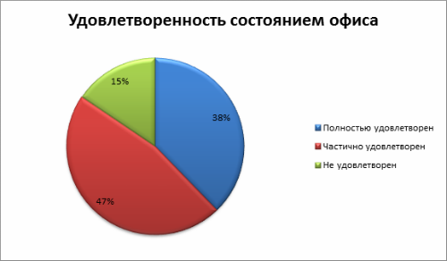 Большинство респондентов (47%) оценивают комфортность офиса недостаточно высоко. Полностью удовлетворены условиями, созданными в офисе, 38% опрошенных. 15% офисных работников не устраивает состояние офиса, в котором они работают.