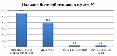Более половины опрошенных респондентов (55,6%) ответили, что в офисе есть вся необходимая им бытовая техника (микроволновая печь, холодильник).