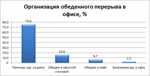 75,6% респондентов приносят еду на работу из дома, 15,6% опрошенных обедают в офисной столовой.