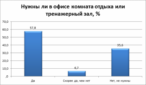 На вопрос, нужны ли в офисе тренажерный зал и комната отдыха, большинство респондентов (57,8%) ответили утвердительно, так как, по их мнению, это положительно влияет на здоровье и помогает отвлечься от монотонного труда.  В то же время 35,6% опрошенных считают, что комнаты отдыха в офисах не требуются, потому что отдыхать на работе им некогда.
