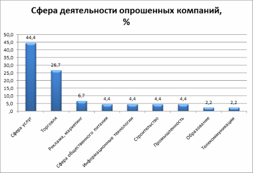 Большинство опрошенных компаний работают в сфере услуг (44,4%%), а также в сфере оптовой и розничной торговли (26,7%).