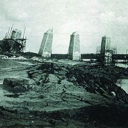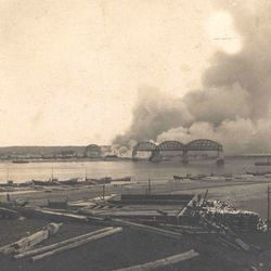 С самого начала работа шла споро, и стройка обещала быть недолгой. Но по воле случая дважды строительство приходилось приостанавливать. Летом 1914 года на мосту случился пожар. По неосторожности одного из рабочих-клепальщиков одна из раскаленных заклепок, которыми скрепляли железные конструкции мостовых пролетов, упала в сухие стружки, лежавшие внизу. Сгорели все строительные леса, на возведение которых потребовалось больше месяца, а убыток составил более 2 млн. рублей.