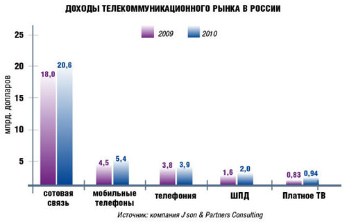 Российской, как и глобальной, телекоммуникационной отрасли повезло, пожалуй, больше остальных сегментов рынка: положительная динамика здесь продолжилась и в нелегкие для экономики времена. Разумеется, рост доходов в разгар кризиса несколько снизился (по данным Росстата, с 18% в 2008 году до 2,9% в 2009-м). Однако уже в 2010 году бизнес-телеком активно наверстывает упущенное. К концу этого года аналитики компании J'son & Partners Сonsulting предрекают прирост российского рынка в сегменте сотовой связи на уровне 14% (до 20,6 млрд. долларов), продажа мобильных телефонов увеличится на 20% (до 5,4 млрд. долларов), услуги широкополосного доступа в Интернет – на 25% (до 2 млрд. долларов), рынок платного ТВ – на 13% (до 940 млн. долларов), телефония предположительно вырастет лишь на 2% (3,9 млрд. долларов).