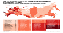 Также РБК сравнил уровень жизни в разных городах России, соотнеся зарплату горожанина с прожиточным минимумом в регионе за период с 2012 по 2014 год. В среднем по городам России отношение составляет составляет 3,9 раза, хотя в 1990 году оно равнялось более 4,5 раза. Согласно исследованию, лучше всех живется в Чукотском автономном округе (5, 76), сложнее всего приходится горожанам Крыма, где сегодня зарплаты хватает только на 2,6 прожиточного минимума. После Крыма идут Ивановская и Смоленская области (2,7).