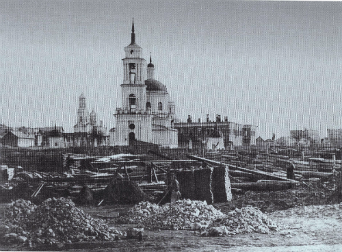 Один из первых в Симбирске фотоснимков сделан в 1865 году, через год после пожара. Вид на Троицкий переулок примерно с того места, где сейчас «Детский мир» на улице Гончарова. За строительными материалами видна уже восстановленная Троицкая церковь. За ней справа обгорелое здание почтовой конторы - это и есть Дворец Пустынниковых, повидавший в своих стенах Екатерину Великую, Суворова, Пушкина и всех симбирян - героев войны 1812-1814 годов.