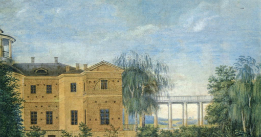 Усадьба Остафьево в 1817 году. Акварель И.Е. Вивьена. Художник запечатлел ту часть здания, где жил и работал Н.М. Карамзин. На втором этаже в полуарке - окно его кабинета. Сюжет рисунка выбран по совету Петра Вяземского, родственником и опекуном которого был Н.М. Карамзин.