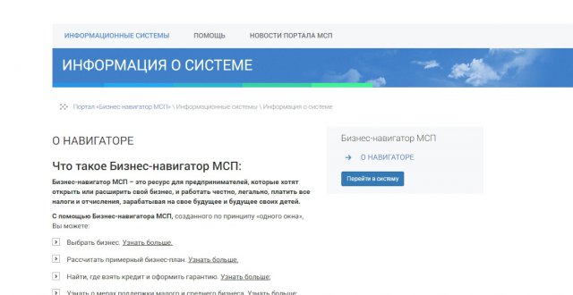 Как сообщает пресс-служба правительства РФ, «Бизнес-навигатор» включает в себя маркетинговый инструментарий с раскрытием доступных рыночных ниш и возможностью расчета потенциала продаж и финансово-экономических показателей. Система открывает предпринимателям доступ к информации обо всех видах федеральной, региональной и муниципальной поддержки субъектов малого и среднего предпринимательства и о специализированных финансово-кредитных продуктах.