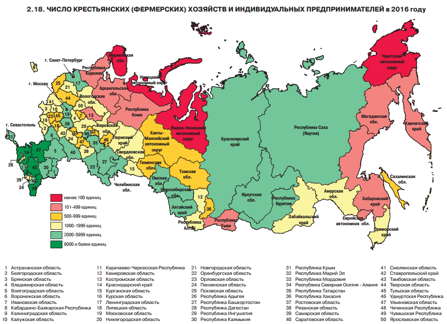 Число крестьянских (фермерских) хозяйств и индивидуальных предпринимателей тоже уменьшилось – с 285,1 тыс. в 2006-м до 174,6 тыс. в 2016-м. При этом общая площадь земли в расчете на одно хозяйство или ИП выросло более чем в два раза – со 103 тыс. га в 2016 году до 240,9 тыс. га в 2016-м.