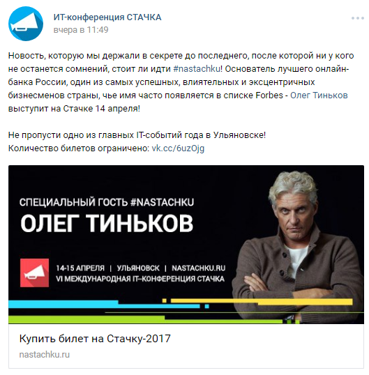 10 апреля организаторы VI Международной IT-конференции «Стачка» заявили на официальной странице мероприятия «ВКонтакте», что специальным гостем конференции станет Олег Тиньков, основатель интернет-банка «Тинькофф».