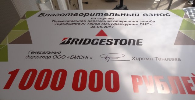 Еще одним ярким моментом праздника стало вручение благотворительного взноса от компании «Бриджстоун»: японский производитель перечислил 1 млн рублей на нужды Центральной городской клинической больницы (отделение травматологии).
