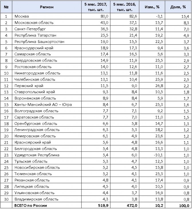Топ-30 региональных рынков традиционно возглавляют Москва (80 тыс. автомобилей) и Московская область (43 тыс.), на долю которых суммарно приходится почти четверть российского рынка (23,7%). При этом столичный рынок за год потерял 3,1%.