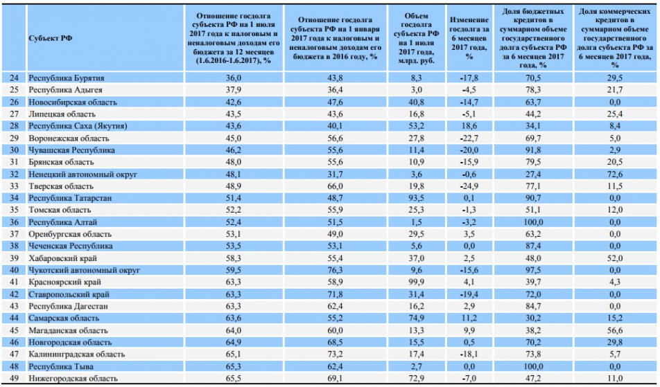 Ульяновская область заняла в рейтинге 51-е место. Государственный долг региона 1 июля 2017 года составил 25,1 млрд рублей, или 69,1% от налоговых и неналоговых доходов областного бюджета за 12 месяцев. За первое полугодие госдолг Ульяновской области вырос на 6%.