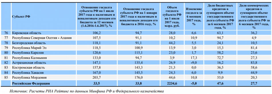 РИА Рейтинг сравнил уровень долговой нагрузки субъектов РФ в первом полугодии 2017 года. Суммарный объем госдолга регионов по состоянию на 1 июля снизился на 5%, составив 2,234 трлн рублей. Объем муниципального долга вырос на 2,8%, до 350,9 млрд рублей. Общий госдолг регионов и муниципальных образований на 1 июля сложился в сумме 2,585 трлн рублей, что на 4,9% ниже, чем полгода назад.