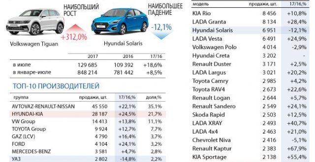 Лидером традиционно является группа AVTOVAZ-Renault-Nissan, реализовавшая в июле 45,6 тыс. машин, что соответствует доле рынка в 35%. На втором месте находится Hyundai-KIA с 28,2 тыс. проданными экземплярами и рыночной долей около 22%. Третью строчку занимает VW Group с объемом 14,4 тыс. автомобилей и долей 11%. Таким образом, эти три группы вместе занимают 68% российского авторынка.