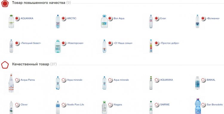По результатам исследования, девять товаров смогли дотянуться до опережающих стандартов Роскачества. Это «Волжанка», «Липецкий бювет», «Новотерская», «О! Наша семья», «Простое добро», ARCTIC, Aquanika, Bon Aqua и Evian. Данные образцы, за исключением Evian, могут претендовать на государственный Знак качества ввиду своего российского происхождения, сообщили в Минпромторге РФ.