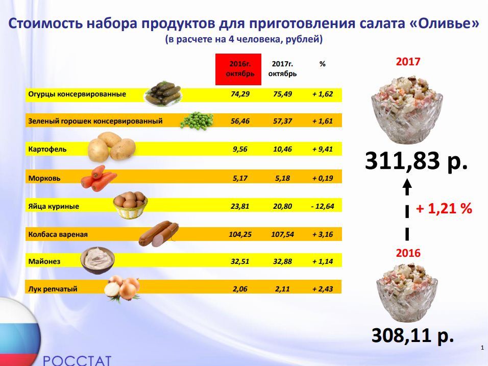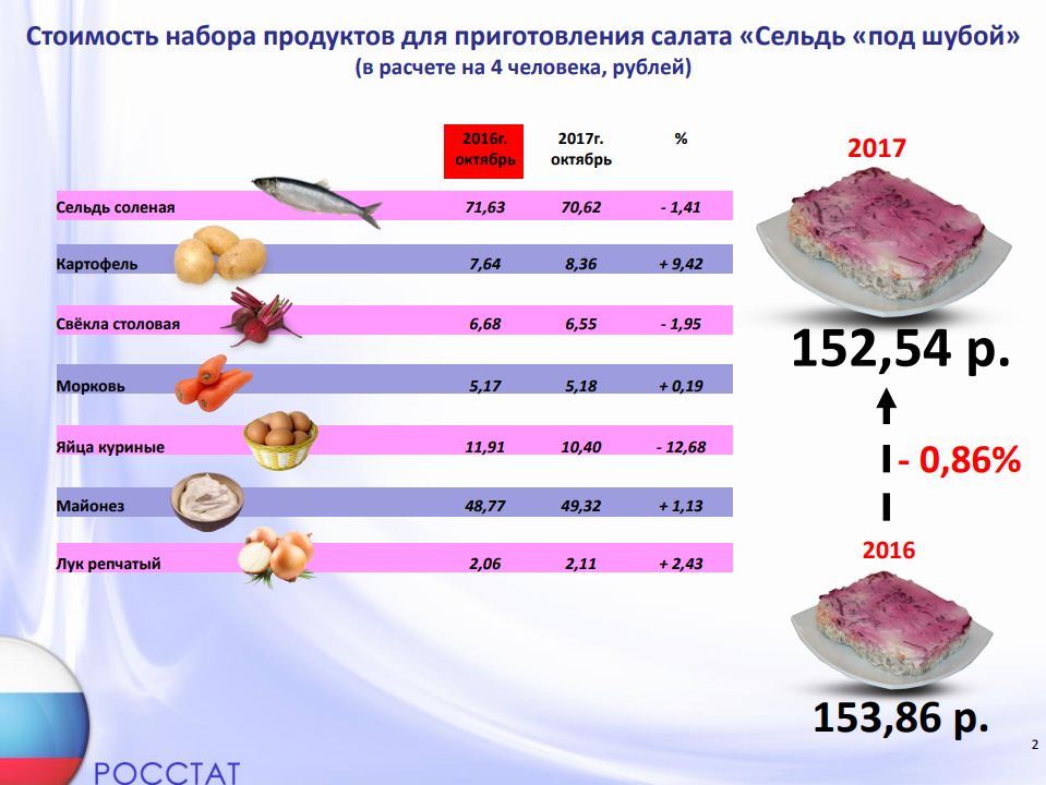 По данным на октябрь 2017 года, средняя стоимость приготовления четырех порций «Оливье» в России составляет 312 рублей, «Сельди под шубой» – 153 рубля, говорится в материалах Росстата.