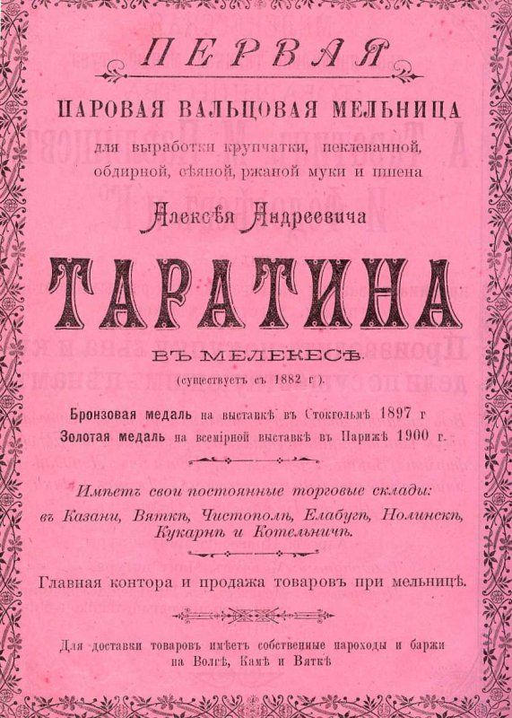 Таратинская мука и крупа отмечены золотыми медалями на выставке в 1900 году в Париже, в 1907 году в Мадриде и Ростове –на – Дону, в 1911 году в Риме, а также в Стокгольме.