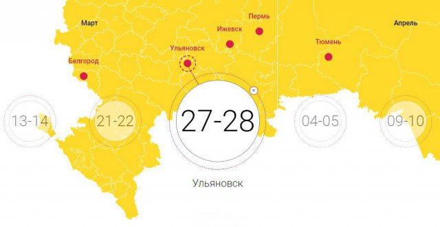 Open Innovations Startup Tour – 2018 пройдет в десяти городах – Перми (6-7 февраля), Южно-Сахалинске (28 февраля – 1 марта), Тюмени (5-6 марта), Ижевске (13-14 марта), Калининграде (21-22 марта), Ульяновске (27-28 марта), Белгороде (4-5 апреля), Улан-Удэ (9-10 апреля) и Великом Новгороде (17-18 апреля).