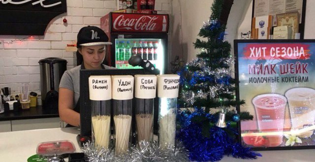 Первое заведение привлекло необычным ассортиментом. Здесь предлагают лапшу, роллы, суши, напитки. За прилавком все чисто и убрано, однако на кухню пройти удалось не сразу: работники кафе отказались пустить постороннего человека. Помещение для приготовления пищи согласился показать владелец кафе Big Box и Pizza Box Владимир Варфоломеев.