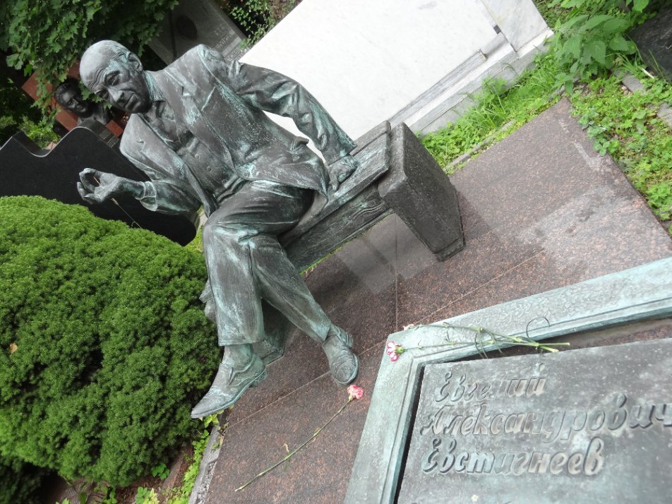 На могиле оперного певца Собинова – умирающий лебедь, а на погосте театрального деятеля Вахтангова – абстрактная фигура в плаще с капюшоном без лица. Но все же многие селебрити вполне узнаваемы. Даже не глядя на надписи, можно легко идентифицировать Дунаевского, Тихонова, Кио, Фурцеву... Евгений Евстигнеев присел на лавочке с сигаретой – как живой! Рядом с грустным Никулиным – его любимая собака. Вальяжно развалился в кресле мраморный Федор Шаляпин...