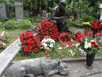 На Новодевичьем кладбище можно увидеть работы известных скульпторов, например, народного художника России Александра Рукавишникова. До чего пронзительная скульптура – бронзовая пара танцоров, преклонившая колени на могиле хореографа Игоря Моисеева. А свежая работа Рукавишникова посвящена Льву Дурову и представляет собой высокий постамент из мрамора и бронзы, который венчает мальчуган в широких штанах и кепке.