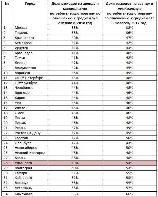 По данным компании, среднестатистическая ульяновская семья с двумя работающими взрослыми по состоянию на начало мая тратила на аренду квартиры и минимальную потребительскую корзину примерно 49% доходов, тогда как год назад показатель составлял 53%.