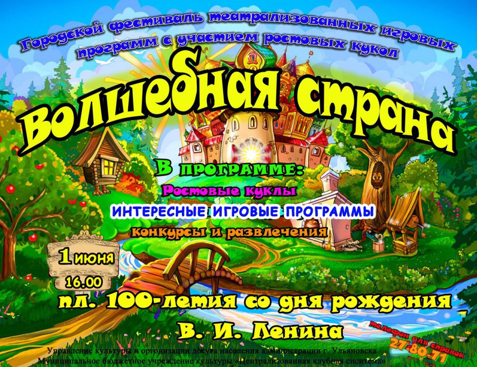 1 июня в 16:00 на площади 100-летия В.И. Ленина откроется ежегодный фестиваль игровых программ с участием ростовых кукол «Волшебная страна». Фестиваль приурочен не только к Международному дню защиты детей, но и к 370-летию Симбирска-Ульяновска.