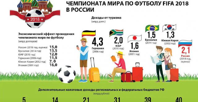 Из регионов-организаторов наибольший денежный эффект ожидается в Москве – по оценке FIFA, чемпионат даст столичному ВРП 251 млрд рублей. Санкт-Петербург получит 139 млрд рублей, остальные регионы куда меньше: Самарская область – 73 млрд рублей, Ростовская – 71 млрд рублей и т.д. Меньше всего денег от ЧМ, по прогнозам, достанется Татарстану – 30 млрд рублей.