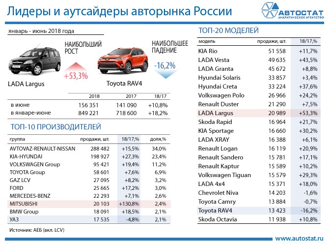 Топ-10 производителей возглавляет группа AVTOVAZ-Renault-Nissan, реализовавшая 288,5 тыс. автомобилей, что соответствует 34% всего рынка. На второй строчке находится KIA-Huindai с показателем 198,9 тыс. единиц и рыночной долей 23,4%. Третье место занимает Volkswagen Group с объемом продаж 95,4 тыс. автомобилей, что соответствует доле в 11,2%.