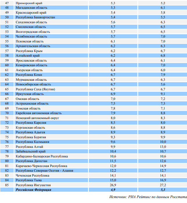В списке РИА Рейтинг лидирует Москва с традиционно низким уровнем безработицы – 1,3%. Далее идут Санкт-Петербург (1,5%), Ямало-Ненецкий (2%) и Ханты-Мансийский (2,4%) автономные округа, Московская область (2,7%), Татарстан и Хабаровский край (3,3%), Воронежская область (3,6%).