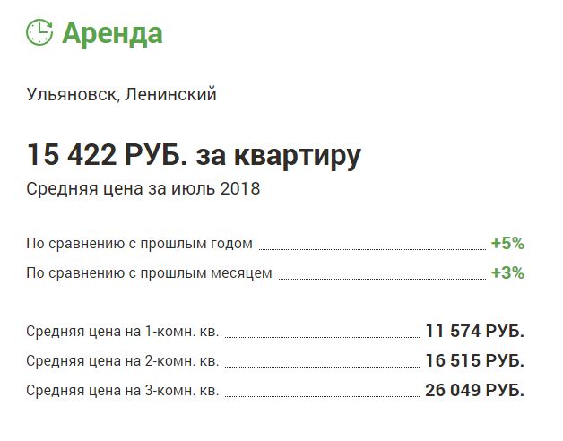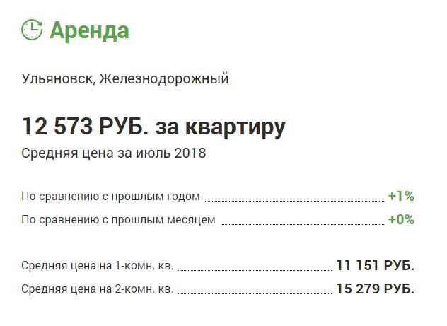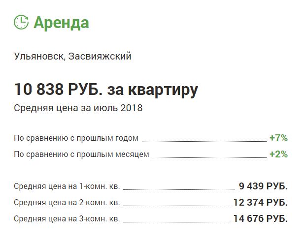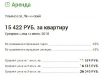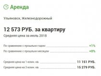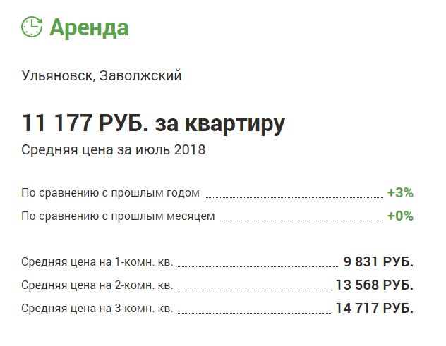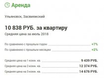 По данным Domofond.ru за июль 2018 года, средняя стоимость аренды квартиры в Ульяновске составляет 12,1 тыс. рублей. Это на 6% больше, чем было в июле 2017-го.