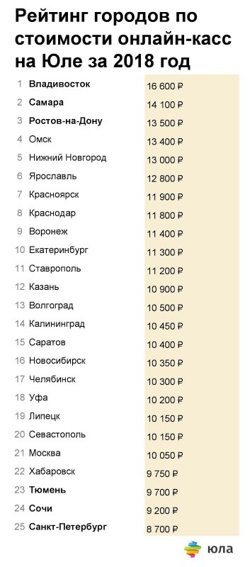 Если говорить о стоимости онлайн-касс в отдельных регионах, то самые высокие цены оказались во Владивостоке (16,6 тыс. рублей), Самаре (14,1 тыс. рублей) и Ростове-на-Дону (13,5 тыс. рублей). Дешевле всего кассы продавались в Тюмени, Сочи и Санкт-Петербурге – от 8,7 до 9,7 тысяч рублей, сообщила Юла.