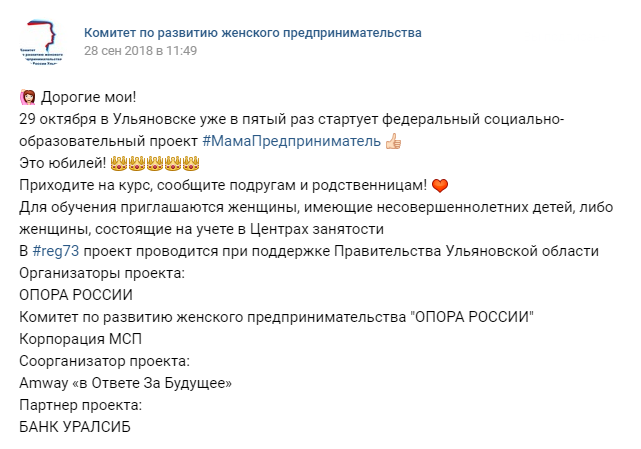 Пятый федеральный образовательный проект «Мама-предприниматель» стартует в Ульяновской области 29 октября, сообщил комитет по развитию женского предпринимательства УРО «Опора России».