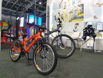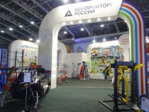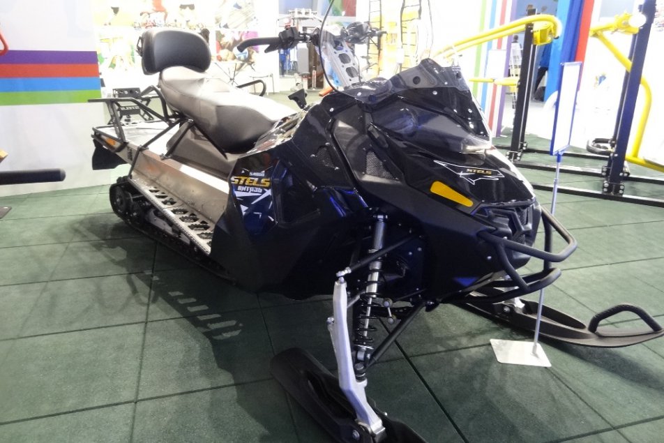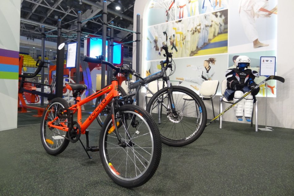 На стенде Минпромторга президенту продемонстрировали различные виды спортивного инвентаря, сделанного в России, в частности, снегоход «Витязь», велосипеды и байдарку.