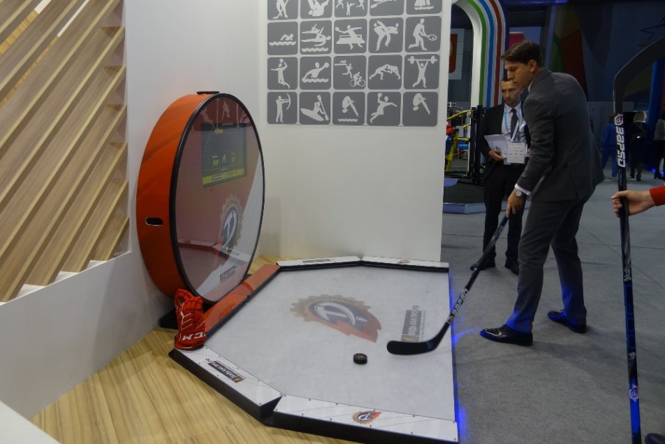 На форуме Владимиру Путину представили новинки производителей спортинвентаря на выставке «Современный спорт. Инновации и перспективы». Во время осмотра стенда Всероссийского физкультурно-спортивного общества «Трудовые резервы» главе государства показали хоккейный тренажер, который может появиться в спортивных уголках компаний и предприятий.