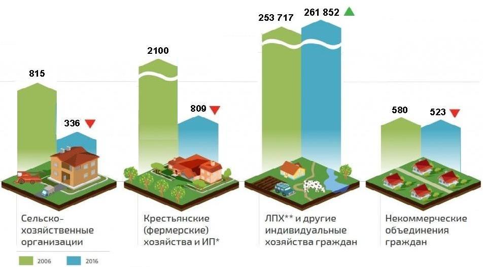 Характер структурных изменений в сельском хозяйстве области за последние 10 лет такой же, как и в целом по стране: выросло число ЛПХ граждан – по области на 3,2% (до 261,8 тысяч), но уменьшилось количество сельскохозяйственных организаций более чем на 50% (до 336), а также крестьянских (фермерских) хозяйств и ИП на 61% (до 809) и некоммерческих объединений граждан на 9,8% (до 523). Одновременно возрос удельный вес сельхозорганизаций, осуществляющих сельскохозяйственную деятельность с 56% до 84%, КФХ и ИП – с 31% до 86%.