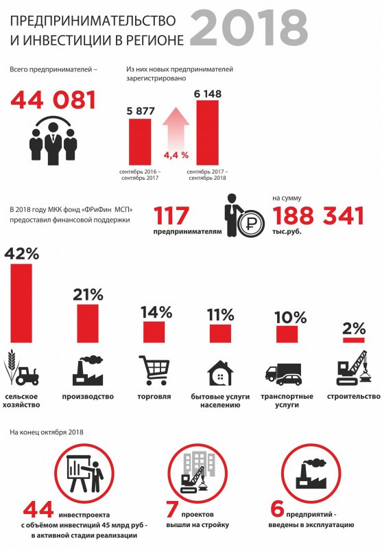В Ульяновской области зарегистрировано свыше 44 тыс. субъектов малого и среднего предпринимательства. В период с сентября 2017 года по сентябрь 2018-го количество новых субъектов МСП выросло на 4,4%, до 6148.