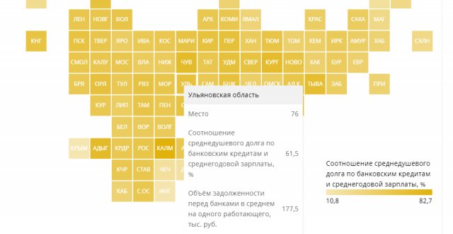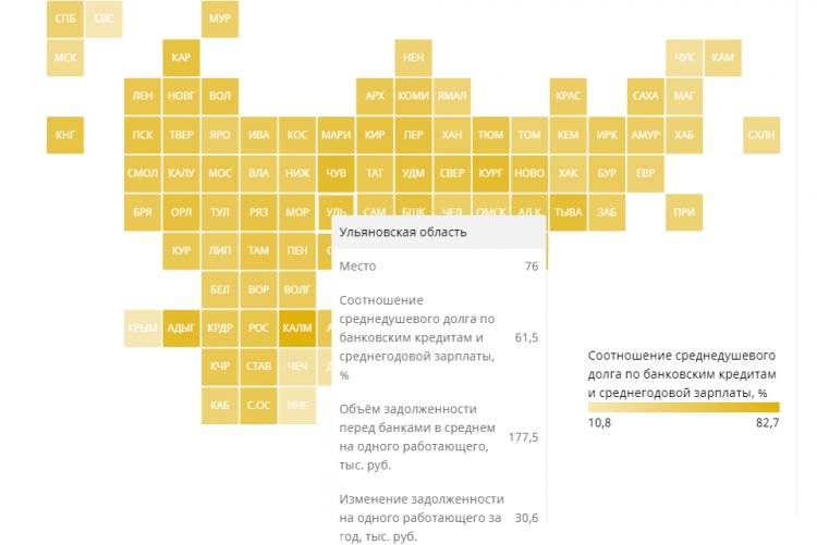 Ульяновская область вошла в десятку субъектов РФ с самым закредитованным населением. По данным РИА Рейтинг, задолженность среднестатистического ульяновского работника перед банками достигает 61,5% от его годовой зарплаты. Среднее значение по России – 45%.
