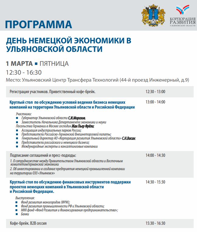 Организатором мероприятия выступает Корпорация развития Ульяновской области. В наноцентре состоятся два круглых стола, посвященных условиям ведения бизнеса и финансовым инструментам поддержки проектов немецких компаний.