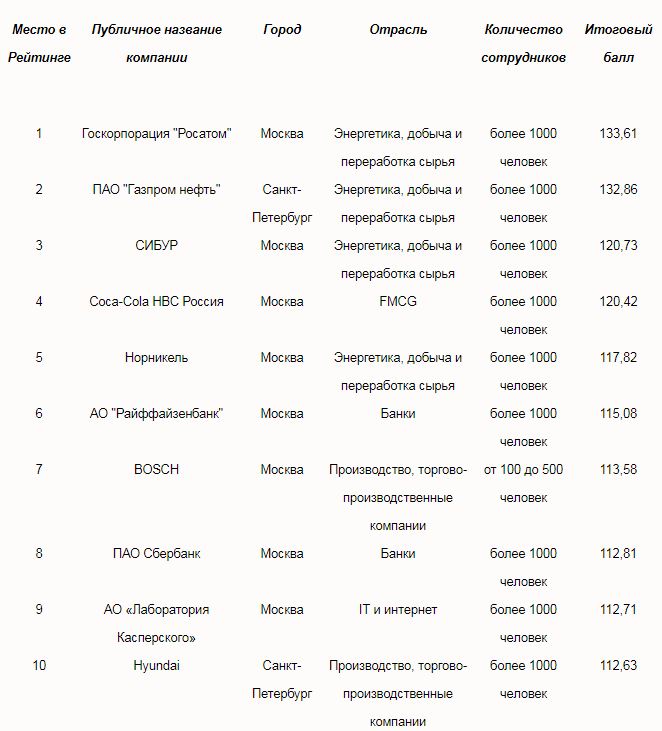 Первое место в рейтинге получила Госкорпорация «Росатом» (Москва). Вторую строчку заняла компания ПАО «Газпром нефть» (Санкт-Петербург). Тройку лидеров замкнул «СИБУР» (Москва).