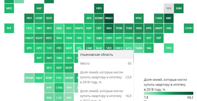 23,9% семей в Ульяновской области доступна покупка двухкомнатной квартиры в ипотеку, подсчитал РИА Рейтинг по итогам 2018 года. Это больше, чем в 2017 году (16,9%), однако на фоне других регионов России результат оказался низким – лишь 65 место.