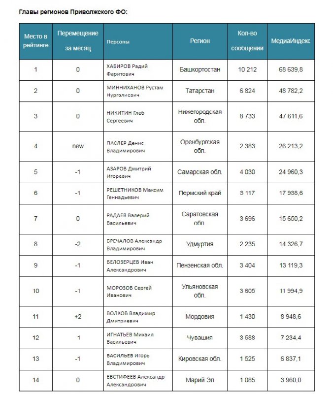 В Приволжском ФО в марте 2019 года лидерами медиарейтинга стали врио главы Башкортостана Радий Хабиров (1 место), президент Татарстана Рустам Минниханов и губернатор Нижегородской областиГлеб Никитин на второй и третей позиции соответственно. «Новичком» рейтинга (new) стал врио губернатора Оренбургской области Денис Паслер.