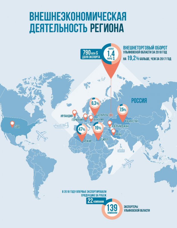 Всего экспортерами Ульяновской области являются более 139 организаций. Из них 22 компании в 2018 году впервые реализовали свою продукцию за рубеж.