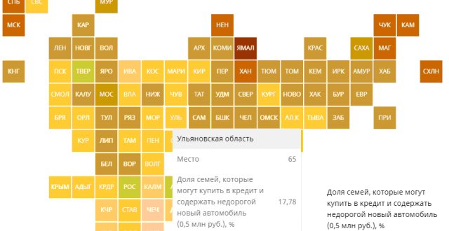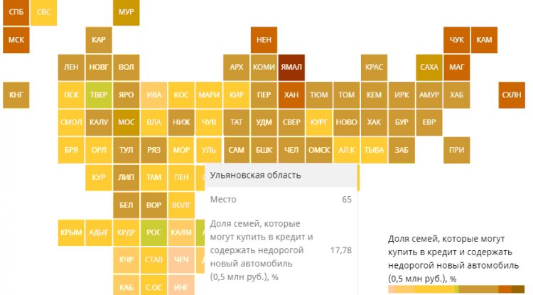 В рейтинге регионов по доступности нового автомобиля в кредит Ульяновская область заняла 65 место. Лидером в списке стал Ямало-Ненецкий АО, где, по результатам исследования, 66% семей могут позволить себе машину в кредит.