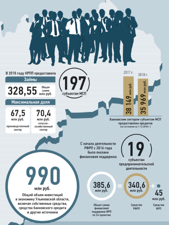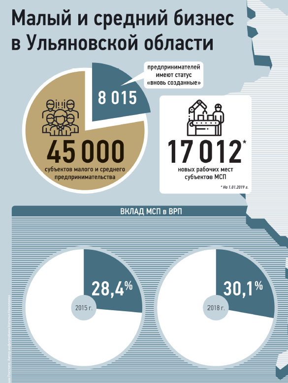 Вклад малого и среднего предпринимательства в ВРП Ульяновской области в 2018 году составил – 30,1%. За 3 года этот показатель вырос на 1,7%.