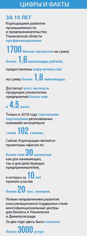 Ульяновская Корпорация стала первым(!) в стране объединенным проектным офисом, реализующим национальную политику в сфере развития предпринимательства. Сейчас это структура, возглавляющая экосистему предпринимательства в регионе. У Корпорации развития промышленности и предпринимательства Ульяновской области – большие перспективы: представители делового сообщества отметили, что за 10 лет сделано немало, но сколько еще будет сделано впереди! За 10 лет Корпорацией профинансировано 1700 бизнес-проектов на сумму более 1,6 миллиарда рублей, предоставлены поручительства на сумму более 1,8 миллиарда. Достигнут рост экспорта продукции ульяновских предприятий более чем в 4,5 раза. Только в 2018 году торговыми партнерами региональных компаний-экспортеров стали 102 страны.