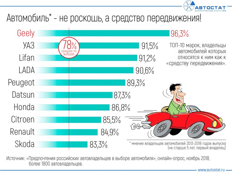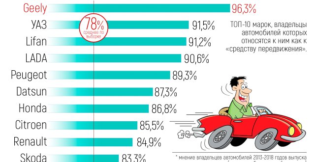 В первую десятку рейтинга попали только массовые марки (помимо вышеуказанных – еще LADA, Peugeot, Datsun, Honda, Citroen, Renault, Skoda). «Однако это вовсе не значит, что среди владельцев автомобилей премиального сегмента мнения о машине как о средстве передвижения не встречается вовсе. Так, например, среди владельцев Mercedes-Benz этот показатель равен 57,4%, а у Audi – 54,4%», – комментирует «Автостат».