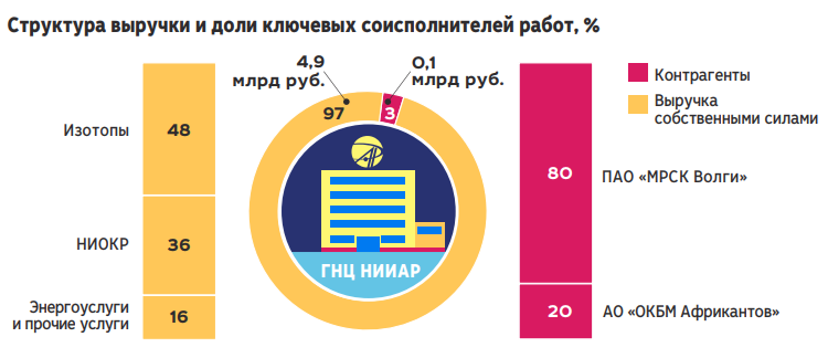 По данным документа, выручка института выросла на 779 млн рублей и достигла 5 млрд рублей. 48% отгрузки НИИАР получил по экспортному направлению. Основной вклад в выручку от реализации радионуклидной продукции внесли продажи препаратов молибдена-99, стронция-89, йода-131 и изделий на основе радионуклидов селена-75, иридия-192, кобальта-60, калифорния-252.