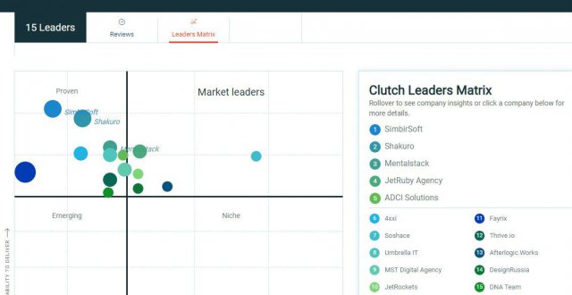 Авторитетное аналитическое агентство Clutch.co (США) регулярно составляет рейтинги лучших поставщиков b2b-услуг в области создания программного обеспечения, мобильных приложений, рекламы. Аналитики исследуют деятельность участников рынка на основании комплекса критериев, в их числе качество работ в портфолио, опыт и награды, отзывы клиентов.