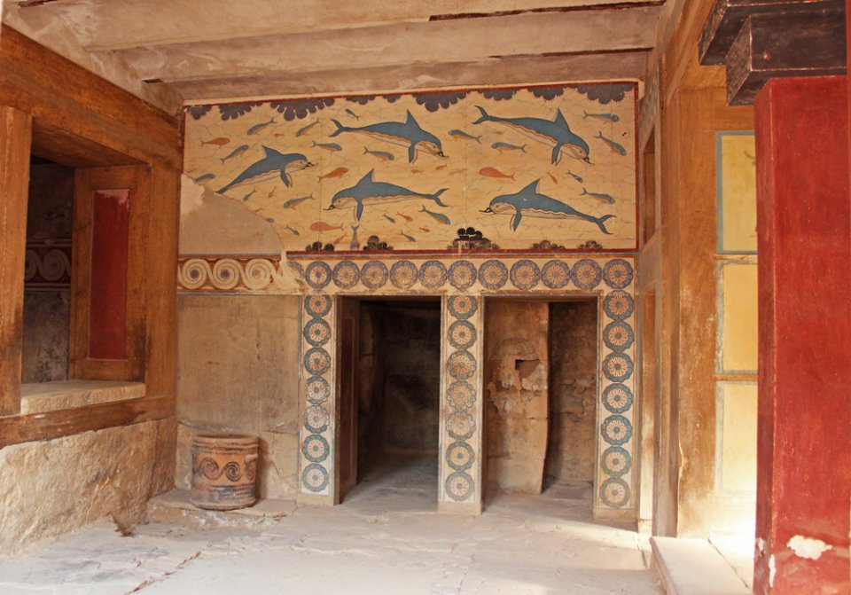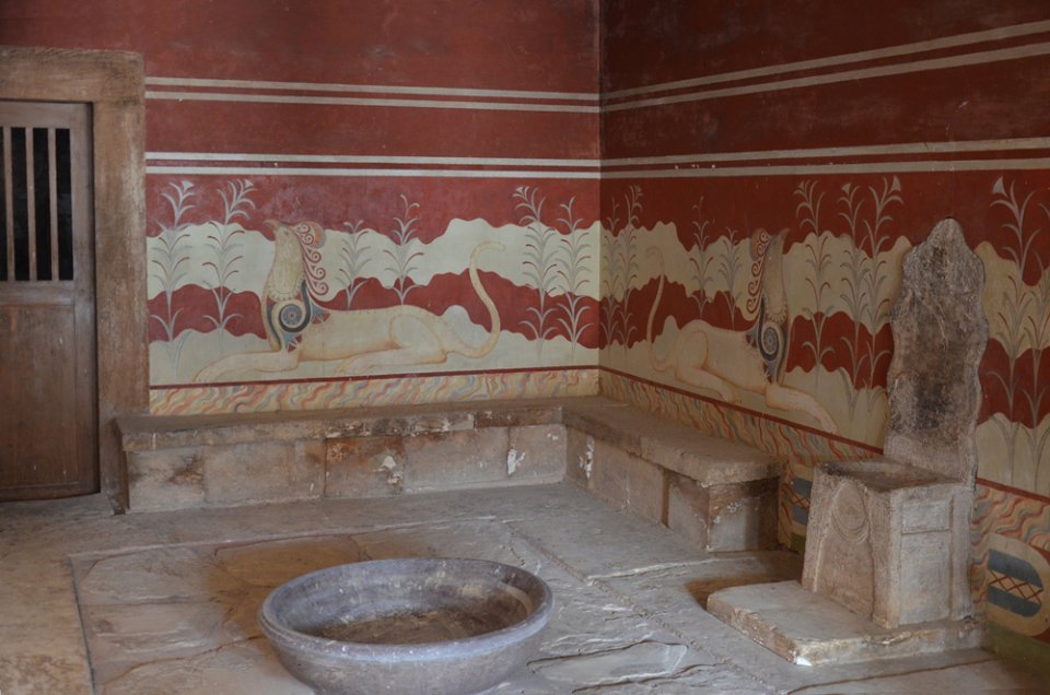 Сейчас на втором этаже над «Тронным залом» находится самое любимое туристами место – Зал фресок. Здесь под надежной крышей собраны копии всех настенных росписей, найденных во дворце. Оригиналы же хранятся в Ираклионском археологическом музее.